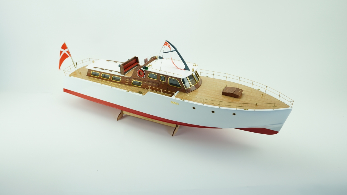 Maketa luxusní motorové jachty z padesátých či šedesátých let dvacátého století. Lodi tohoto typu sloužily pro zábavu/přepravu movitých majitelů, hollywoodských hvězd a jiné smetánky. Tomu také odpovídalo hojné použití mahagonu a teaku v konstrukci lodi, chromovaných kovových částí, luxusně polstrovaných kožených sedaček a jiného nóbl příslušenství.