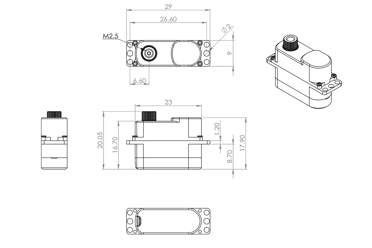 Silné programovatelné tenké digitální mikroservo s titanovými převody uloženými na jednom kuličkovém, jednom samomazném a dvou jehlových ložiscích. Díky přesným předepjatým převodům s minimálními vůlemi a ploché krabičce s výškou 9 mm je zvláště vhodné pro ovládání křidélek a klapek v RC házedlech F3K, malých větroních a motorových modelech s tenkými profily křídla, jako jsou F5D modely pro závody okolo pylonů. Pro dokonalé chlazení i při vysokém zatížení je servo uloženo v hliníkové krabičce s patkami pro montáž na plocho.