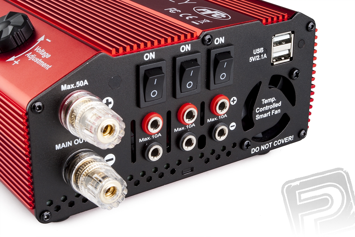 Hlavní výstup zdroje 15-30 V/50 A (max. 1200 W) je opatřen robustními šroubovacími zdířkami pro standardní 4 mm banánky. Navíc jsou k dispozici 3 paralelní zásuvky pro 4 mm banánky opatřené vypínači. Napětí výstupu je nastavitelné pomocí knoflíku na předním panelu, napětí a proud na výstupu jsou zobrazovány na LCD displeji.