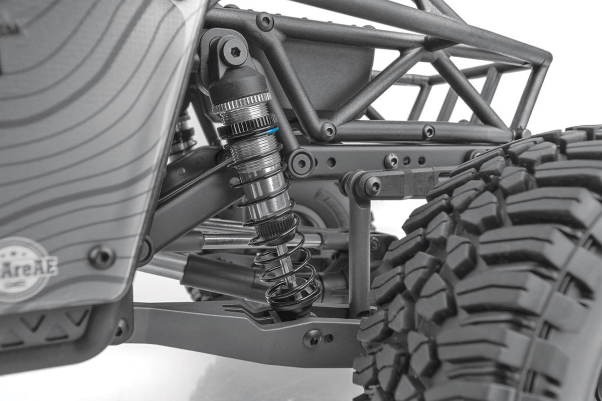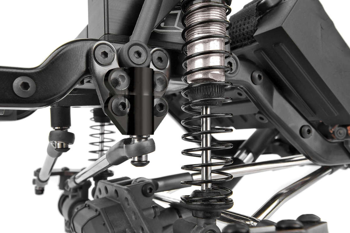 Čím je Enduro Ecto Trail Truck výjimečný? Balíček odpružení Gatekeeper (GKSTM)! Balíček GKSTM se skládá ze zadních vlečných ramen, která posouvají tlumiče dopředu, což umožňuje větší okno pro ladění tlumičů a zajišťuje lepší rozložení hmotnosti. Vlečná ramena jsou spojena se zadní protiprokluzovou tyčí pro stabilnější a konzistentnější odpružení při plazení po skalách. Nastavitelný hliníkový držák pásové tyče pevně přišroubovaný k liště podvozku poskytuje modelu Enduro Ecto spolehlivější a citlivější řízení bez prohýbání. Naše vložky pro uchycení tlumičů s několika montážními pozicemi umožňují přesné vyladění odpružení, ať už se jedná o posunutí tlumičů nahoru, dolů, dopředu nebo dozadu.