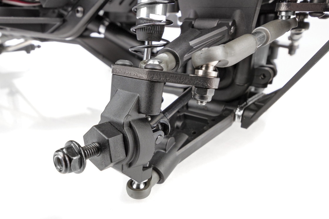 Zavěšení: Odolná vstřikovaná horní a dolní ramena zavěšení s optimalizovanými kulovými čepičkami poskytují maximální kloubovost zavěšení spolu s moderním vzhledem měřítka zavěšení terénních vozidel.