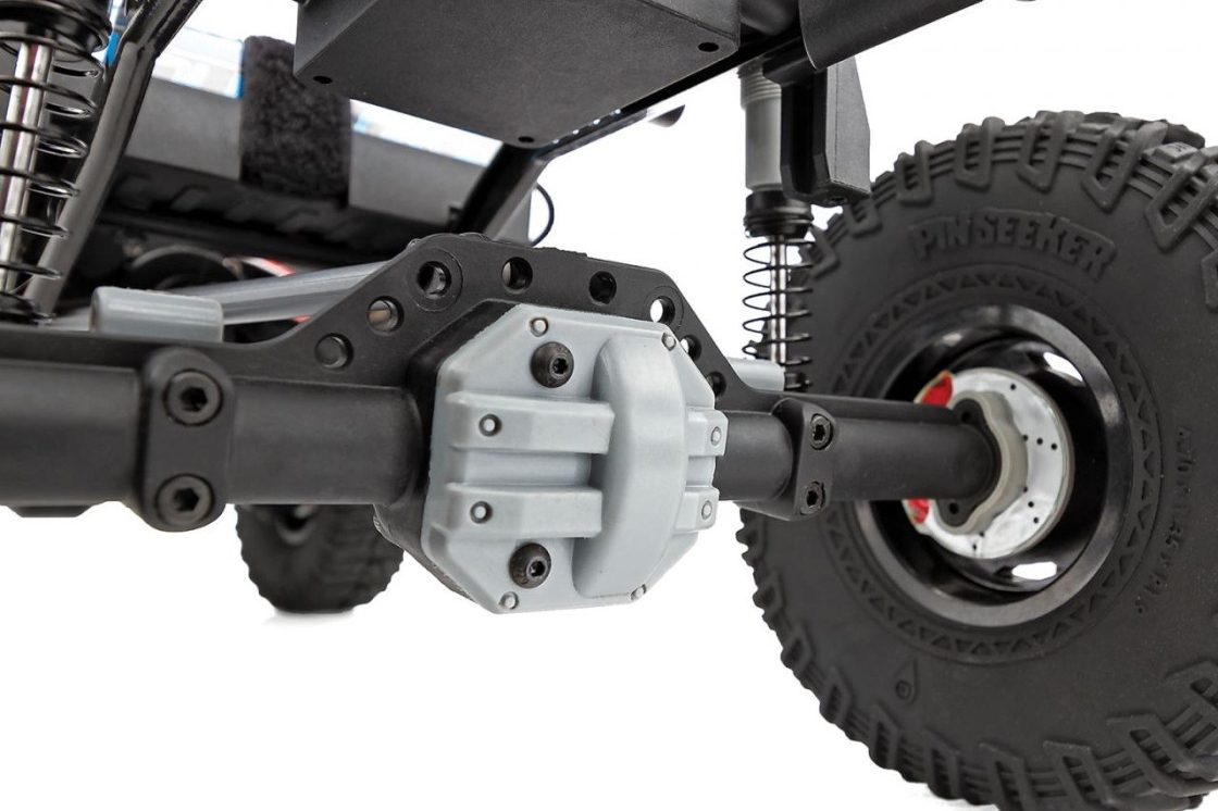 Kola a pneumatiky: O trakci ve všech čtyřech rozích se stará sada 1,9" kol Steelie se zámkem patek a pneumatik PinSeekerTM o rozměrech 1,9" x 4,19". Tyto pneumatiky s agresivním dezénem jsou ideální pro zachycení každého zákoutí ve skalách nebo proorání hustého bláta a písku. Aktualizované nápravy: Nové nápravy s většími vstupními pouzdry (s možností výměny za ložiska) zvládnou vyšší zatížení. Nové kryty diferenciálů mají možnost přidat závaží na vnitřní stranu, aby byl zachován vzhled měřítka, a falešné kotoučové brzdy se třmeny přidávají ještě více detailů měřítka.