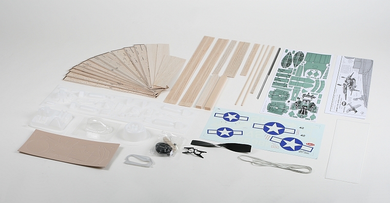 Stavebnice obsahuje: balsové předseknuté díly, balsové nosníky, předseknuté díly z plastikové překližky, vakuově lisované maketové díly (kryt motoru, motor...), čirý acetátový výlisek krytu kabiny, plastovou vrtuli s hřídelí a hlavicí, gumový svazek (guma 5x1mm), ocelovou strunu na podvozek a další drobné díly, plastová kola, potahový papír, rukojeť a vahadlo pro upoutaný model, velký aršík mokrých obtisků, stavební plán.