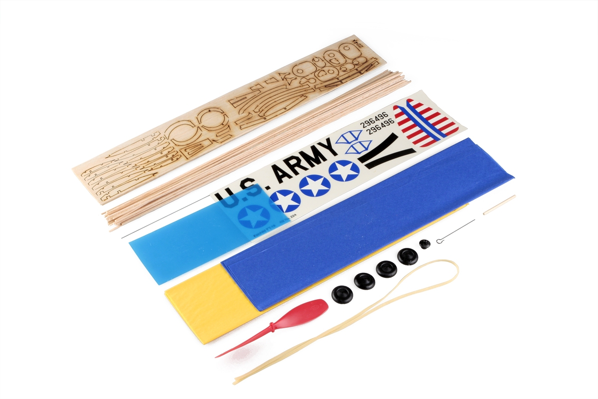 Stavebnice obsahuje: balsové laserem vyřezávané díly, balsové nosníky, plastovou vrtuli s hřídelí a hlavicí, gumový svazek (soutěžní guma FAI TAN II), kola, ocelovou strunu na podvozek a další drobné díly, barevný potahový papír, aršík samolepek, stavební plán.