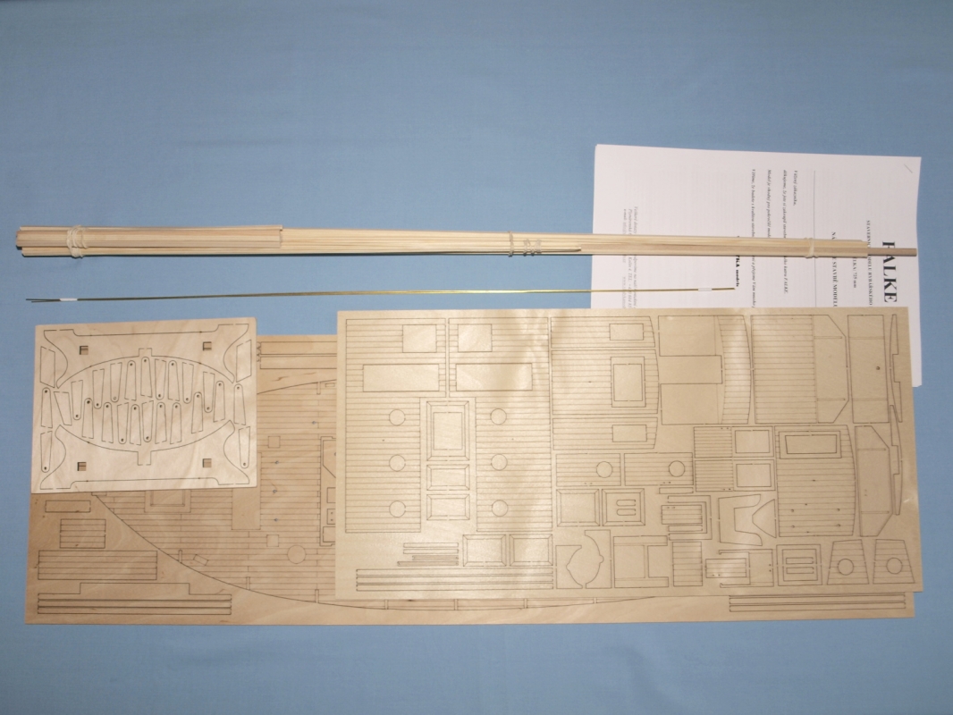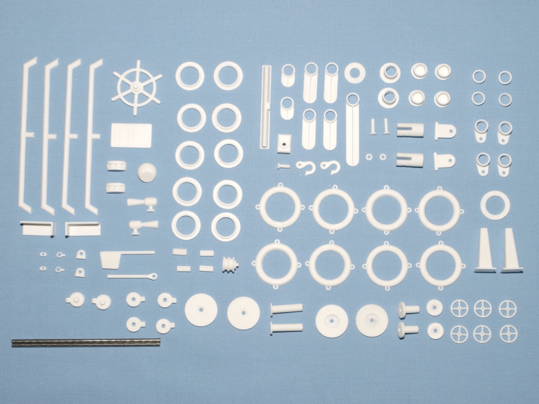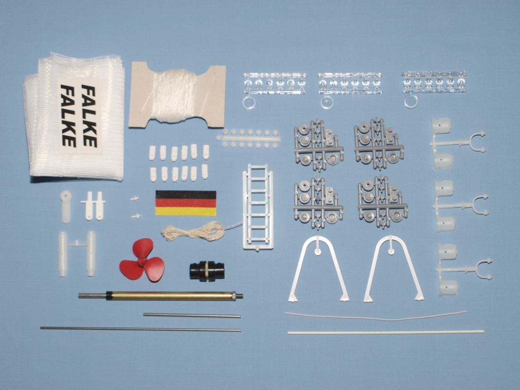 ( záchranné kruhy, zábradlí, světlomety, svítilny, radar, klakson, žebříky, kabinová okna, kladky, kování stěžňů a ráhen, boční jeřáby, díly k navijákům atd. ). Díly podstavce, palubu, jednotlivé části kabiny jsou z překližky, která je gravírovaná a již vyříznutá laserem. Stěžně a ráhna jsou z bukové kulatiny. Výztuhy bortů jsou z borových nosníků.