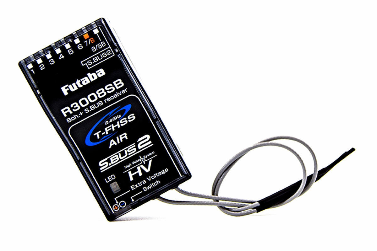 Osmikanálová RC souprava Futaba T-FHSS Air-2.4GHz s telemetrií/S-FHSS. Přesné křížové ovladače, 4 přepínače, 1 otočný ovladač. Paměť 30 modelů, programy pro akrobatická letadla, větroně, vrtulníky a multikoptéry; až 4 let. režimy. V Módu 1, s osmikanálovým přijímačem R3008SB.