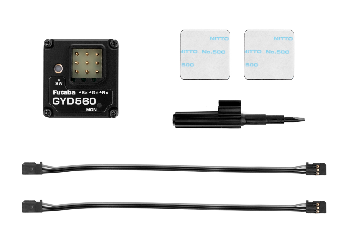 GYD560 je lehké programovatelné dvourežimové mikro gyro s integrovaným MEMS senzorem speciálně vyvinuté pro ovládání a stabilizaci řízení driftovacích modelů aut s možností dálkového řízení zisku a přepínání provozních režimů s pomocí vysílače. Disponuje možnostmi nastavování řady parametrů s pomocí tlačítka a LED na gyru nebo přímo v menu kompatibilních vysílačů Futaba (T10PX s nejnovější verzí firmwaru) a je vybaveno vstupním S.BUS/S.BUS2 portem. Činnost gyra je signalizována LED indikátorem.