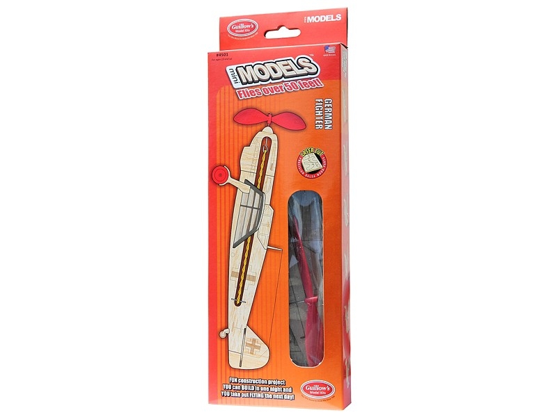 Rychlostavebnice stínové polomakety Me-109 o rozpětí 280mm s pohonem gumovým svazkem z laserem vyřezávaných balsových dílů.