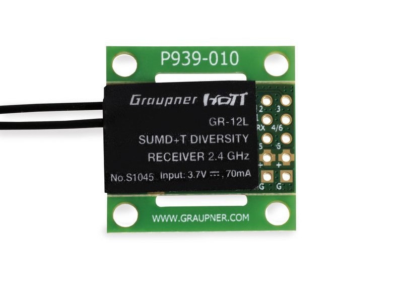 Přijímač GR-12L může ovládat 12 nebo 16 kanálů Přijímač Graupner GR-12L má nejnovější technologii Graupner HoTT 2,4 GHz a nejnovější komponenty a software. Diverzita antény. Technologie HoTT využívá až 75 kanálů. Tím je zajištěna extrémní provozní bezpečnost a necitlivost na vnější rušení. Bez dalších senzorů se přenáší napětí přijímače, teplota a síla signálu. Failsafe a Hold jsou programovatelné. Vstupní citlivost přijímače a tím i rozsah byly významně zvýšeny. Malý a extrémně lehký přijímač se používá v systémech SUMD nebo SBUS nebo SP2048 Copter Flight Controls nebo Flybarless. Hodnota RSSI může být na výstupu CH8, CH12 nebo CH16 pomocí SUMD nebo SBUS nebo SP2048 Přijímač GR-12L má vysokou spolehlivost díky širokému rozsahu napětí 3,6 V - 8,4 V (funkční až 2,5 V), a to i v případě kolísání napětí. Přijímač HoTT jasně ukazuje svůj provozní stav kdykoli prostřednictvím červené LED.
