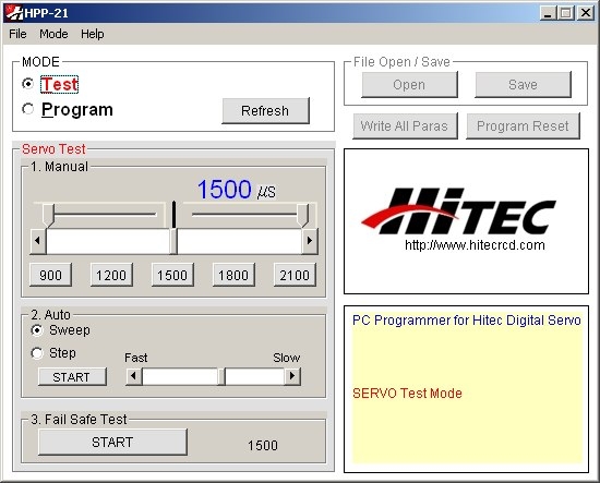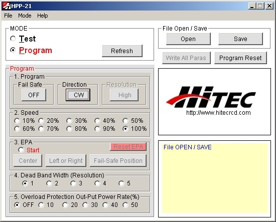 Programátor digitálních serv Hitec: reset na výchozí tovární hodnoty, šířka pásma necitlivosti, smysl otáčení, rychlost otáčení, neutrál, velikost výchylky, zapnutí nebo vypnutí fail-safe, nastavení nouzové výchylky fail-safe.