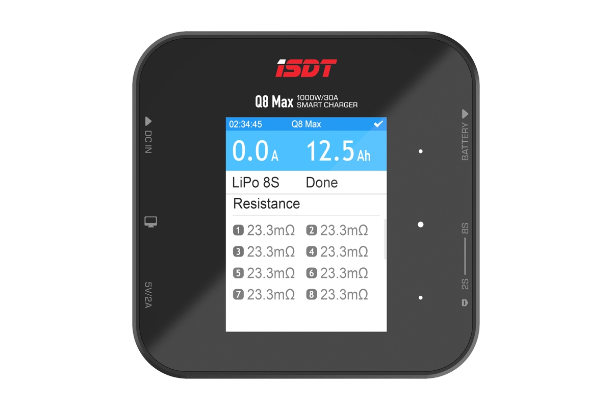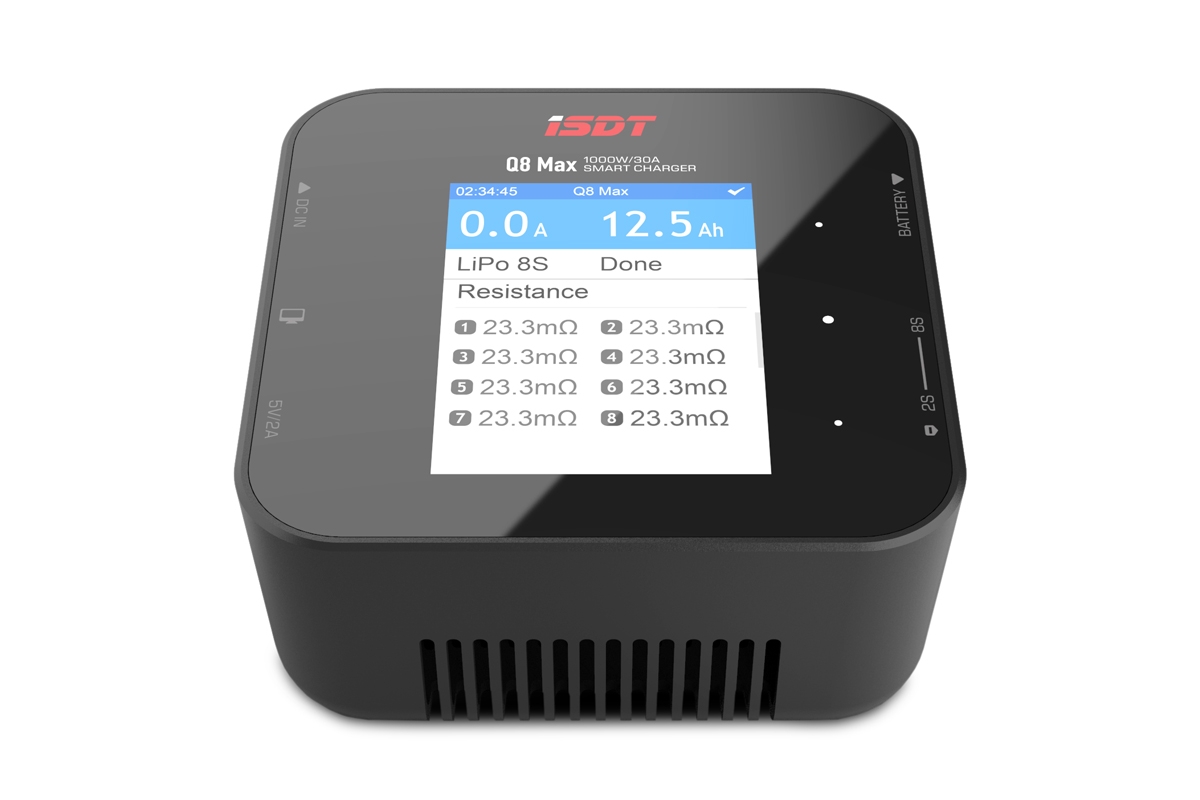Miniaturní nabíječ ISDT Q8 Max 1000W je vysokovýkonný inteligentní nabíječ s napájením z autobaterie nebo stabilizovaného síťového zdroje a velmi jednoduchou a přehlednou obsluhou. Q8 Maxumožňuje nabíjet a vybíjet běžné typy článků (NiCd, NiMH, LiPo, LiHV, Li-ion, LiFe, Pb), navíc je vybaven vestavěným osmikanálovým balancerem, který zajišťují bezpečné nabíjení lithiových akumulátorů. Nabíječ je vybaven barevným LCD displejem a dotykovými programovacími tlačítky, které vám poskytnou možnost komfortního a velice přehledného nastavování parametrů, řízení a sledování průběhu nabíjení/vybíjení.