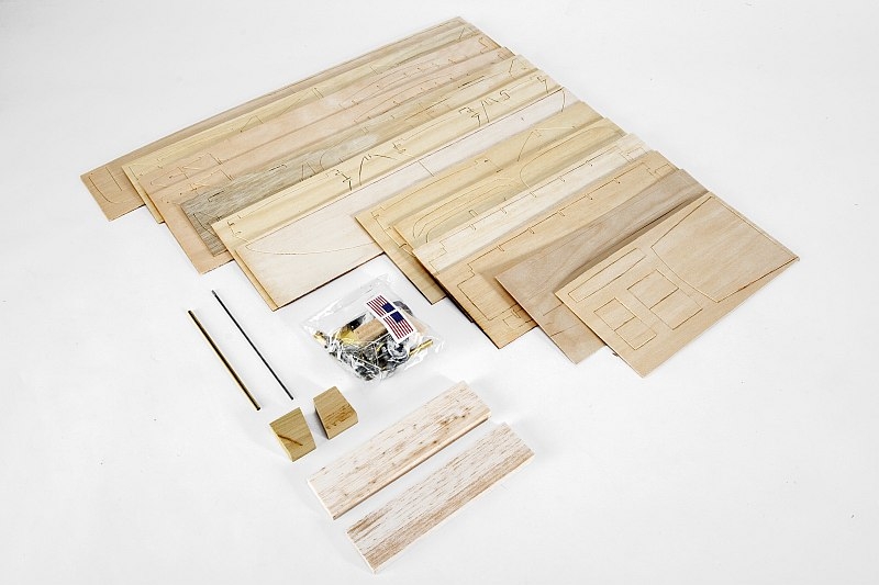 Stavebnice obsahuje: předseknuté překližkové díly trupu, balsové plaňky na obšívku, vakuově lisované plastové díly nástavby, smrkové a plastové nosníky a tyčinky, odlévané kovové díly a další maketové příslušenství, elektromotor 4,8 V, lodní hřídel s pouzdrem a dvoulistým šroubem 25 mm, stavební plán obsahující třípohledový výkres lodi a perspektivní nákresy jednotlivých kroků stavby, návod ke stavbě.