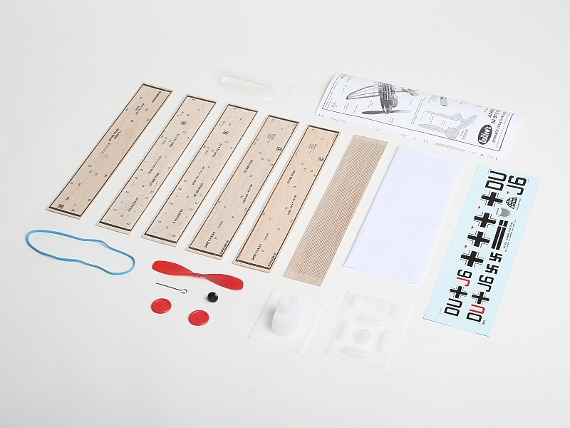 Stavebnice obsahuje: balsové předseknuté díly, balsové nosníky, vakuově lisované díly (kryt motoru, kryt kabiny...), plastovou vrtuli s hřídelí a hlavicí, gumový svazek, kola, ocelovou strunu na podvozek a další drobné díly, potahový papír, aršík mokrých obtisků, stavební plán.