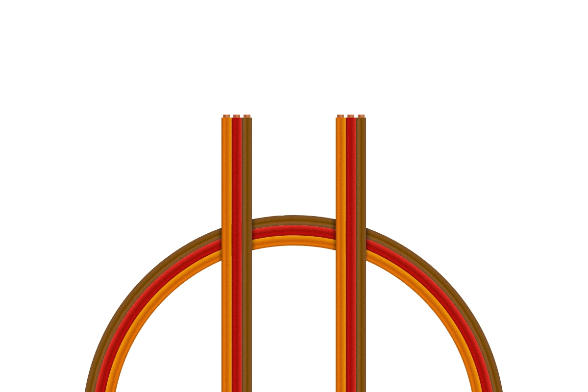 Plochý třížilový kabel tenký v barvách JR (hnědá/červená/oranžová) s PVC izolací, průřez vodičů 0,14 mm2. Vysoce ohebný, lanka ze 72 pramenů 0,05 mm, vnější rozměr 1,1x3,9 mm, max. 48 V, 3A. Vyrobeno v Německu. Cena za 1 meter