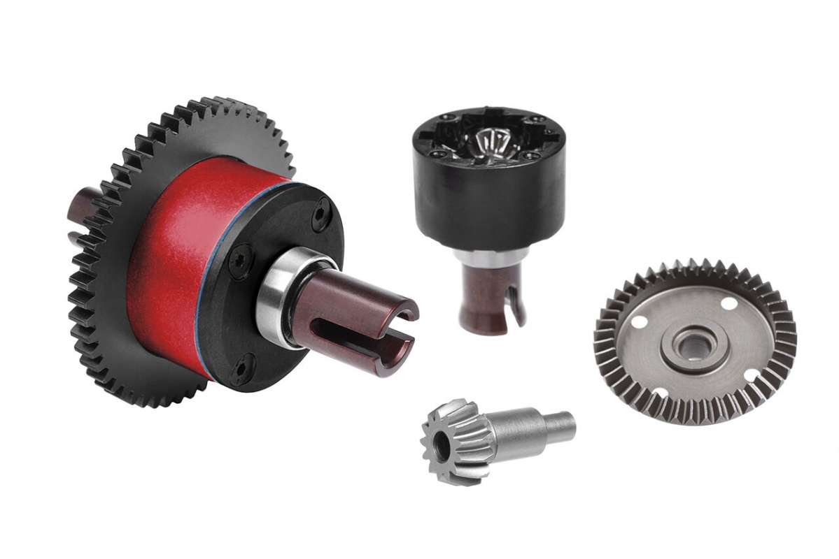 Jádrem tohoto hnacího ústrojí jsou CNC kuželové převody, zářivě červeně eloxovaná hliníková centrální skříň diferenciálu a robustní pružinové ocelové vývody - symfonie pečlivě sehraná pro neústupný výkon a dlouhou životnost. A ve světě Monster Trucků s nadměrnými pneumatikami a koly se vlastnosti tohoto robustního hnacího ústrojí ještě znásobí!