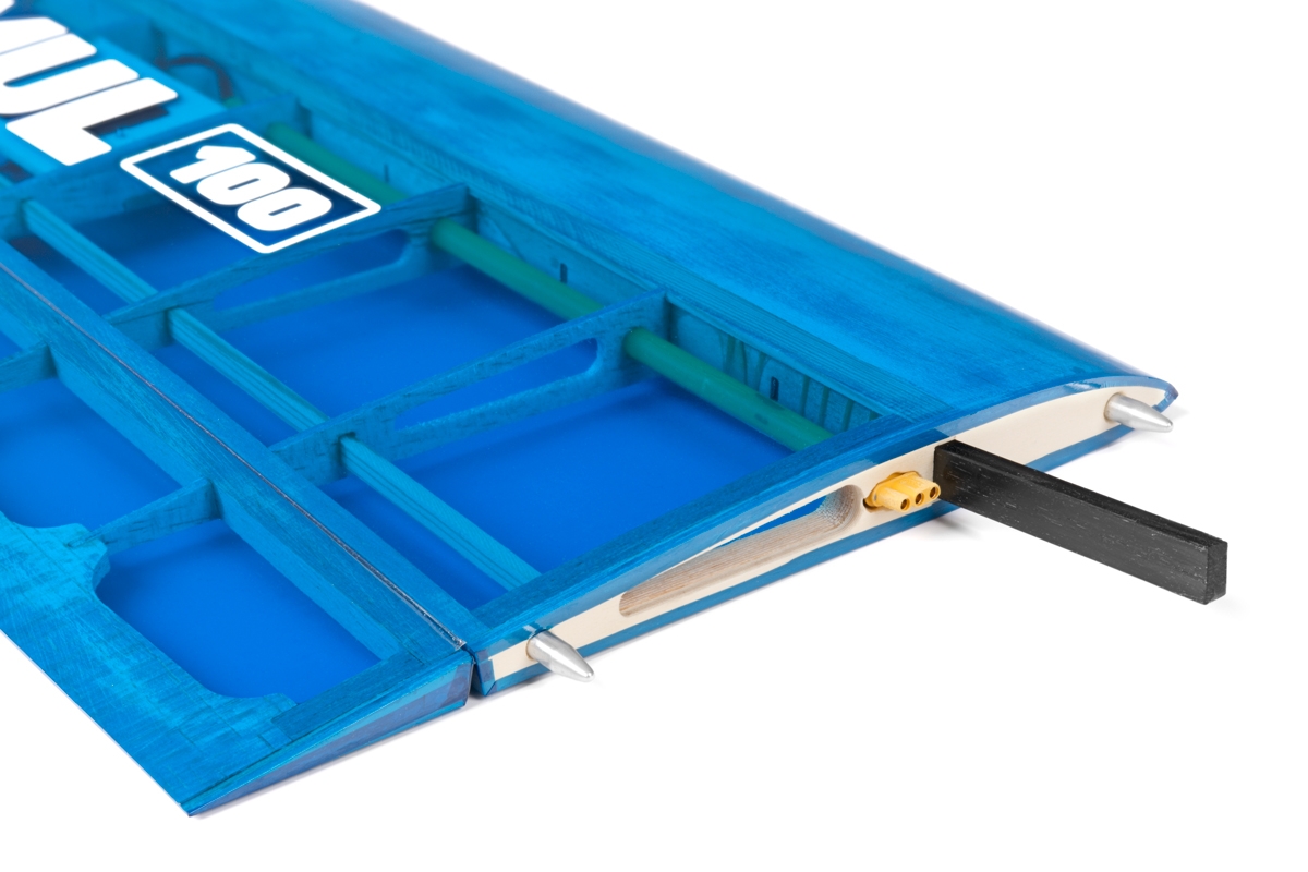 Trojdílné křídlo s profilem AG 40-42 je klasické konstrukce s balsovými žebry a tuhým potahem torzní skříně. Hlavní nosník je tvořen pásnicemi ze smrkových lišt s balsovou stojinou, což zaručuje vysokou pevnost kostry při velmi nízké hmotnosti. Uši s elegantními winglety se k centroplánu připojují uhlíkovými spojkami a duralovými vymezovacími kolíky. Klapky a křidélka jsou ovládány nezávisle čtyřmi servy pomocí krátkých drátových táhel. K trupu se křídlo upevňuje dvěma plastovými šrouby.