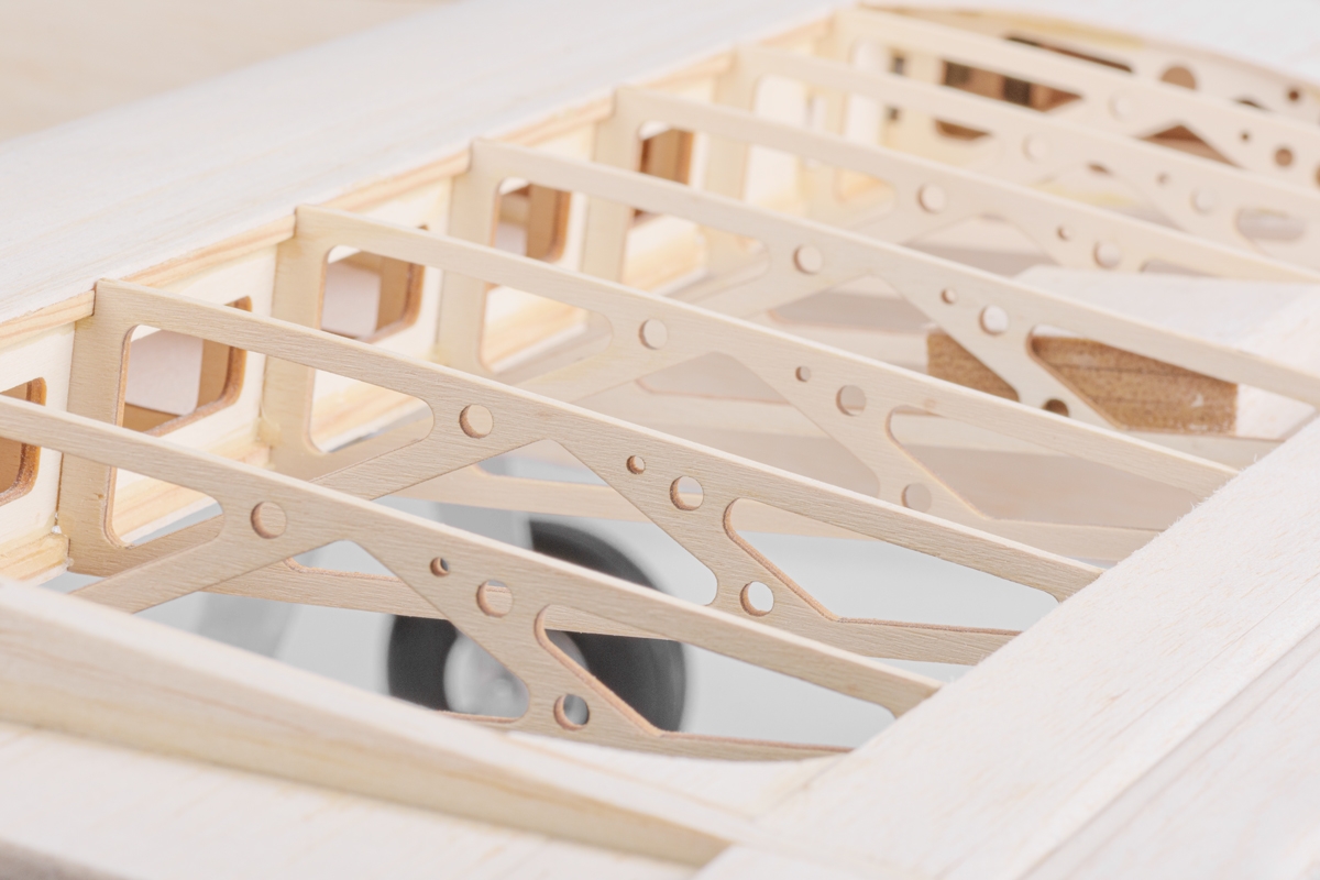 Jednodílné křídlo se souměrným profilem je klasické konstrukce s balsovými žebry a tuhým potahem torzní skříně. K trupu se upevňuje dvěma plastovými šrouby. Stavbu opět usnadňuje použití laserem vyřezávaných dílů se zářezy a výstupky v „puzzle“ stylu, díky níž sestavíte vše správně a nezkrouceně bez potřeby stavebních přípravků. Křidélka po celém rozpětí křídla jsou ovládána dvěma mikroservy s krátkými přímými drátovými táhly. Konstrukce křídla umožňuje táhla a páky křidélek umístit na spodní stranu křídla (vhodné pro létání s podvozkem) nebo na horní stranu křídla (vhodné pro létání bez podvozku s přistáním na břicho do trávy).