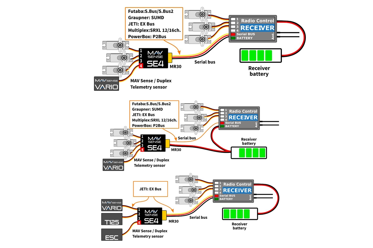 Miniaturní čtyřkanálový expandér pro převod signálu ze sériové sběrnice na standardní servo výstupy. Kompatibilní systémy: Futaba S.BUS/S.BUS2, Graupner SUMD, HoTT telemetrie, JETI EX Bus, Multiplex SRXL 12/16CH, PowerBox P2Bus; libovolně přiřaditelné výstupní kanály. Napájení 5-8,4V, proud až 15A. Rozměry 34x14x9mm, hmotnost 4g, vstupní konektor MR30. Nastavení přes vysílač, Jetibox nebo PC USB interfejs MAV Sense.