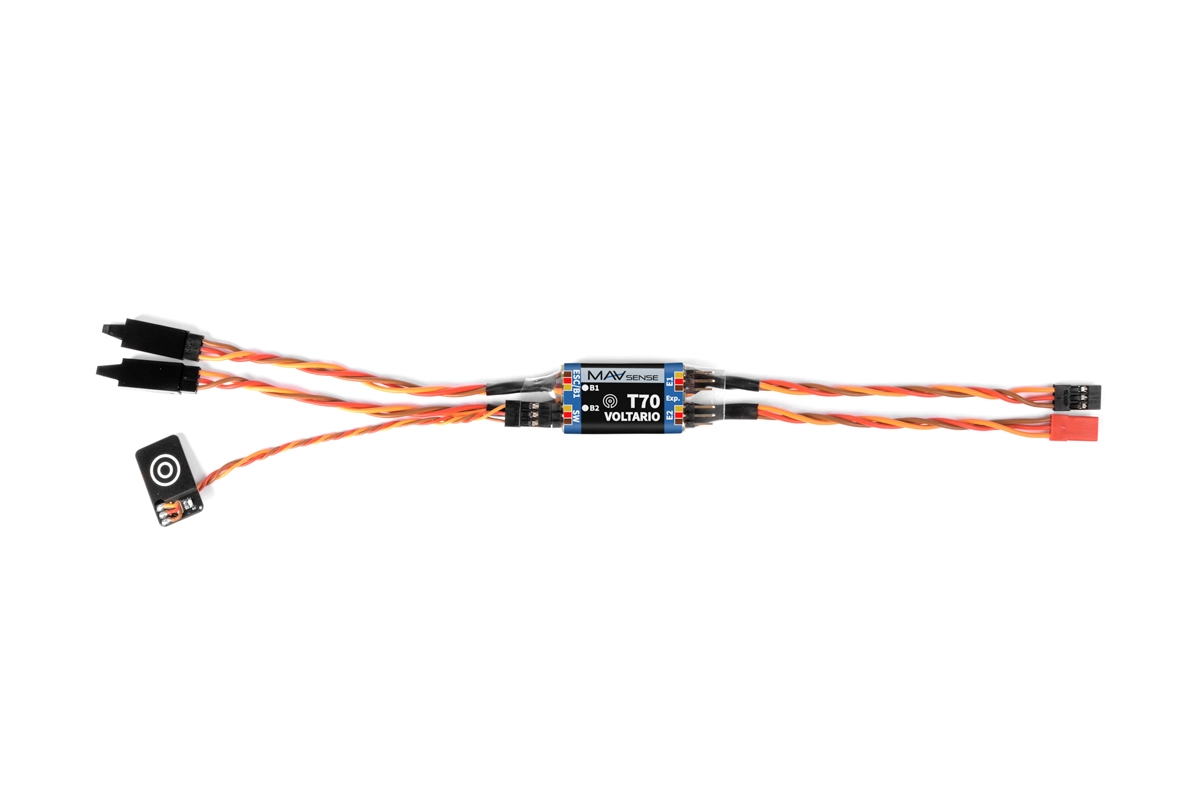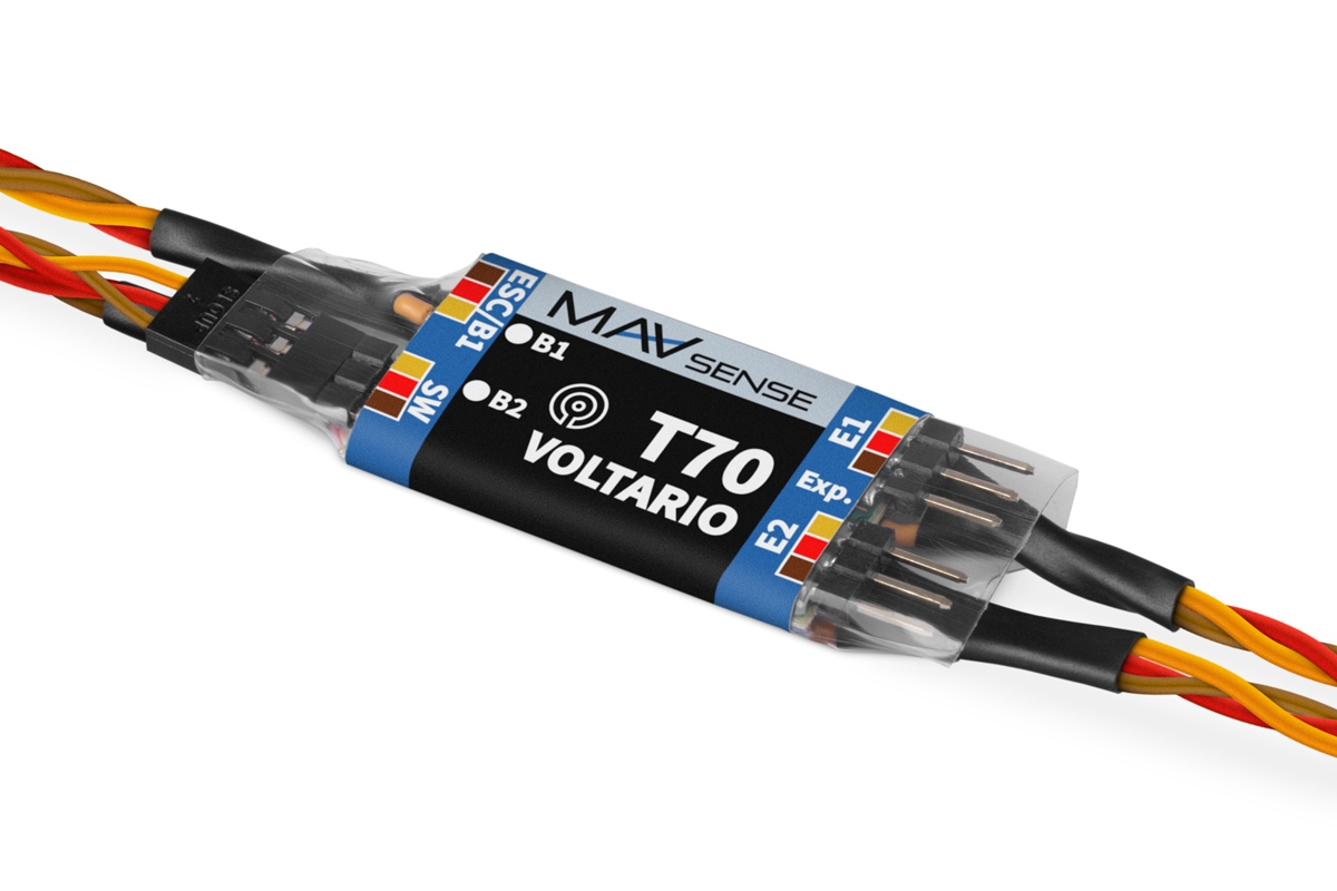 Voltario T70 představuje výkonný digitální systém pro zálohu napájení, jenž nabízí i pokročilé telemetrické funkce. Obsahuje nabíjecí obvod a funkci dotykového vypínače. Zařízení je ideální pro středně velké modely, kde se používají např. HV serva napřímo bez stabilizace napětí.Voltario T70 je vhodné pro modely vybavené buď dvěma přijímačovými bateriemi, případně regulátorem se stabilizací napětí (BEC) v kombinaci s malou záložní baterií. Zařízení preferuje svůj primární bateriový vstup (až 3S LiPo), přičemž v případě poklesu napětí se automaticky přepne na sekundární vstup. Nabíjecí obvod může být volitelně aktivován pro nabíjení záložní baterie z primárního vstupu/obvodu BEC.