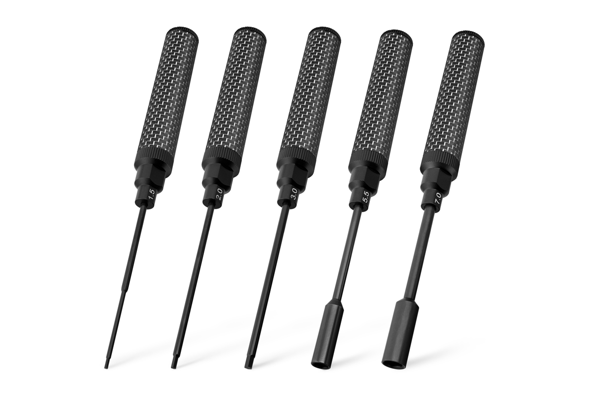 Sada obsahuje černé šroubováky s karbonovou rukojetí velikosti 1.5, 2.0, 3.0mm hex (imbus) a 5.5, 7.0mm nut (nástrčkové).