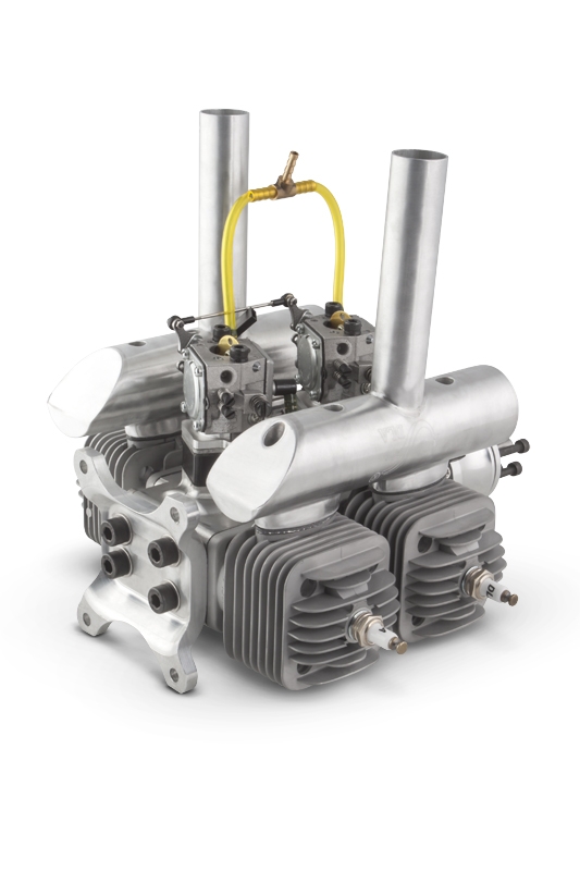 Součástí balení je: motor, 2x elektronické zapalování + 4 svíčky, 2 tlumiče + těsnění výfuku, distanční sloupky, spojovací materiál a návod.