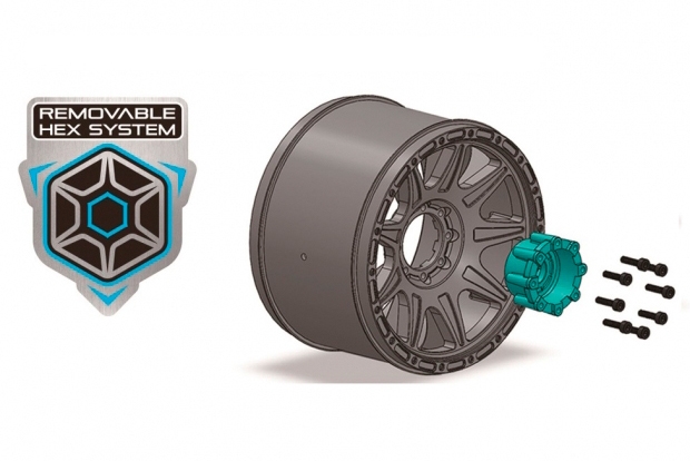 Systém odnímatelných hexů je nová funkce, která vám umožní vybrat si z různých středů, tak aby kola pasovala na vaše RC auto. Ty jsou součástí balení a lze je snadno nasadit a sejmout pomocí přiložených šroubků.