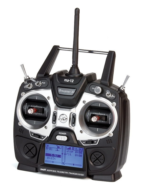 6-kanálová RC souprava se systémem přenosu 2,4 HGz HoTT, s plnohodnotnou telemetrií a 8-řádkovým modře podsvíceným LCD displejem.