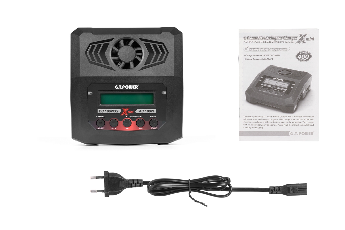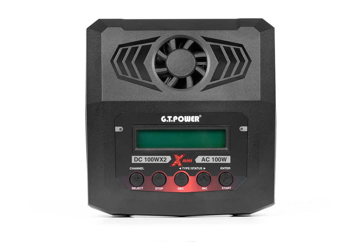 Dvoukanálový nabíječ G.T. POWER X2 mini 2x100W byl konstruován se snahou poskytnout vše potřebné pro nabíjení dvou akumulátorů současně "pod jednou střechou" včetně síťového zdroje a s jednoduchou obsluhou.