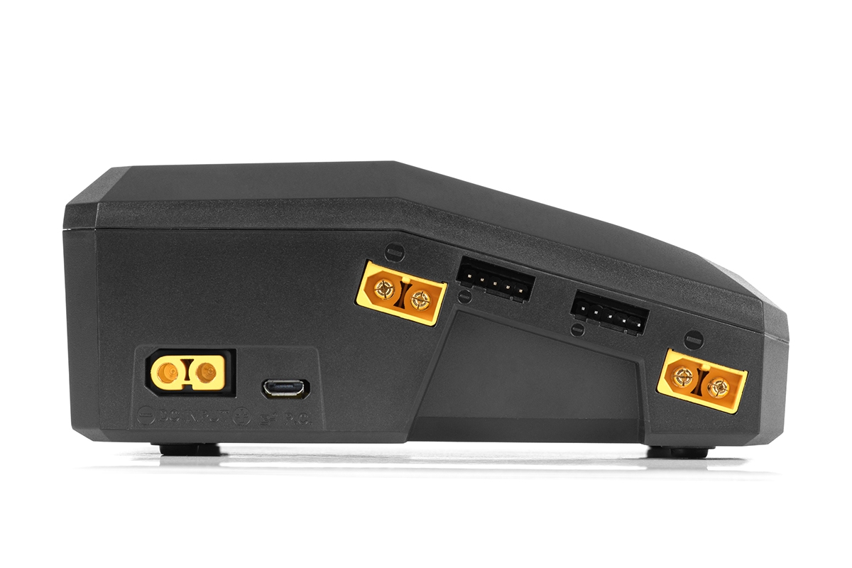Nabíječ je ve všech kanálech vybaven výstupními zásuvkami XT60 a univerzálními zásuvkami pro servisní konektory JST-XH umožňující přímo zapojit silové kabely akumulátoru a servisní konektory JST-XH sad 2-4S – pokud používáte sady s konektory XT60 a JST-XH, obejdete se zcela bez nabíjecích kabelů a adaptérů.