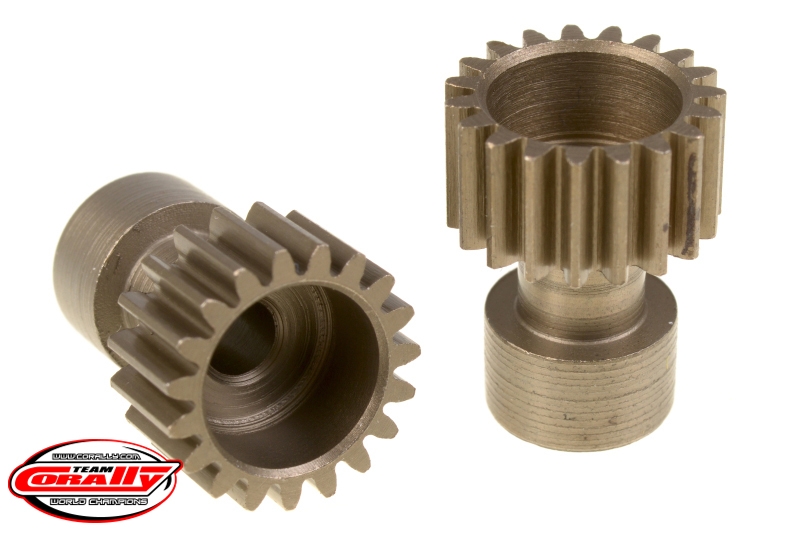 Dlouhé provedení, materiál tvrzená ocel, 19 zubů, modul ozubení 48DP. Pro hřídel motoru o průměru 3.17 mm (1/8 in). Pastorky TEAM CORALLY jsou vyráběny frézováním a následně tvrzeny, čímž je zajištěna vysoká přesnost ozubení. Všechny pastorky TEAM CORALLY jsou vyrobeny v EU.