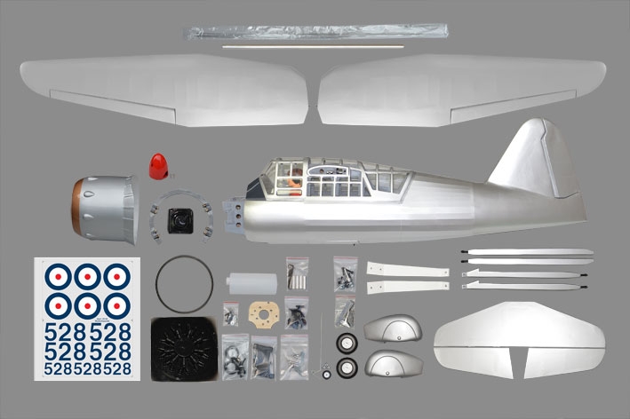 Stavebnice obsahuje: postavený a nažehlovací fólií potažený trup, křídlo a ocasní plochy, nastříkaný laminátový kryt motoru, kola, sadu příslušenství, maketový interiér kabiny a obrázkový návod.