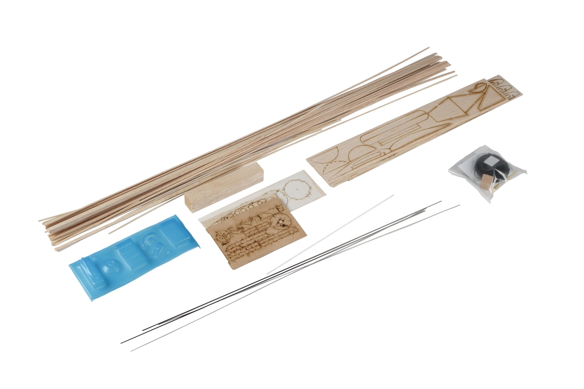 Stavebnice obsahuje: balsové laserem vyřezávané díly, balsové nosníky, vakuově lisované díly (maketu motoru...), ocelovou strunu na podvozek a další drobné díly, lehká kola, potahový papír, aršík samolepek, stavební plán.