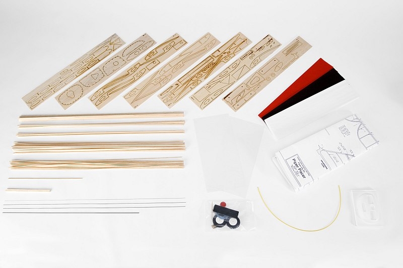 Stavebnice obsahuje: balsové laserem vyřezávané díly, balsové nosníky, vakuově lisované díly (kryt motoru...), čirou plastovou fólii na "zasklení" kabiny, ocelovou strunu na podvozek a další drobné díly, lehká pěnová kola, barevný potahový papír, aršík samolepek, stavební plán.