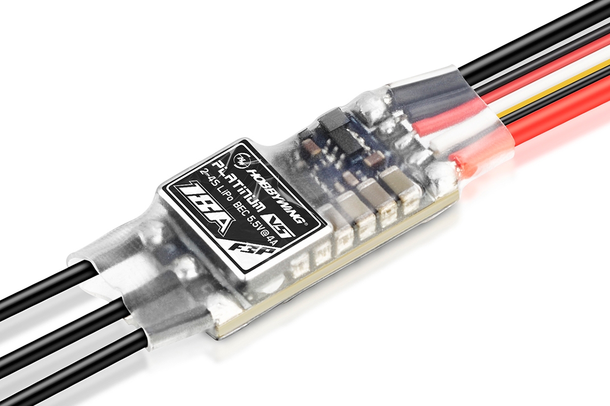 Regulátor nejvyšší řady firmy Hobbywing speciálně konstruovaný pro 3D a 4D halové akrobatické modely letadel. Obousměrný režim pro 4D, brzda s reverzací chodu motoru. Spínaný BEC 5,5V 4/6A . Trvalý proud 18A, špičkový 30A. Napájení 2-4S LiPo. Hmotnost 11,9g. Rozměry 24,6x12,8x7,5mm.