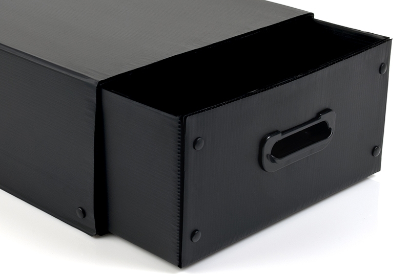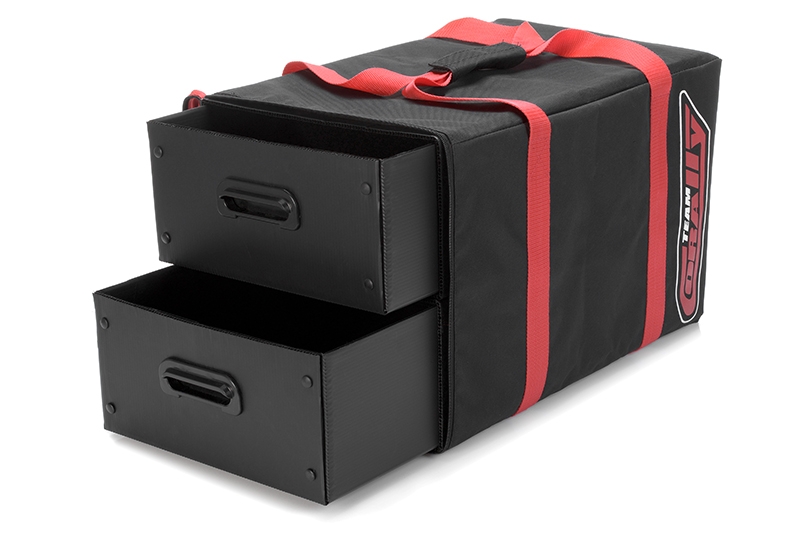 Přepravní taška se dvěma šuplíky pro přepravu příslušenství k RC autům nebo jeho příslušenství. Rozměr šuplíku 30 x 48 x 15 cm, rozměr tašky je 54 x 34 x 33 cm. Šuplíky jsou vyrobeny z plastového kartonu. Úchyty šuplíků jsou vyrobeny z plastového výlisku. Každý šuplík je vsazen do kartónového obalu, čímž je zamezeno jeho vysypání.