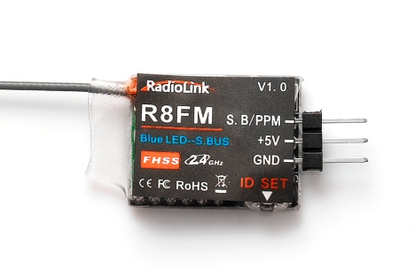 Radiolink R8FM 2,4GHz je miniaturní 8-kanálový přijímač FHSS s frekvenčním přeskokem kompatibilní s vysílači Radiolink T8FB a T8S. NENÍ kompatibilní s vysílači Radiolink AT9S a AT10 II. R8FM nabízí přepínatelný sériový signálový výstup S-BUS nebo PPM (8 kanálů).