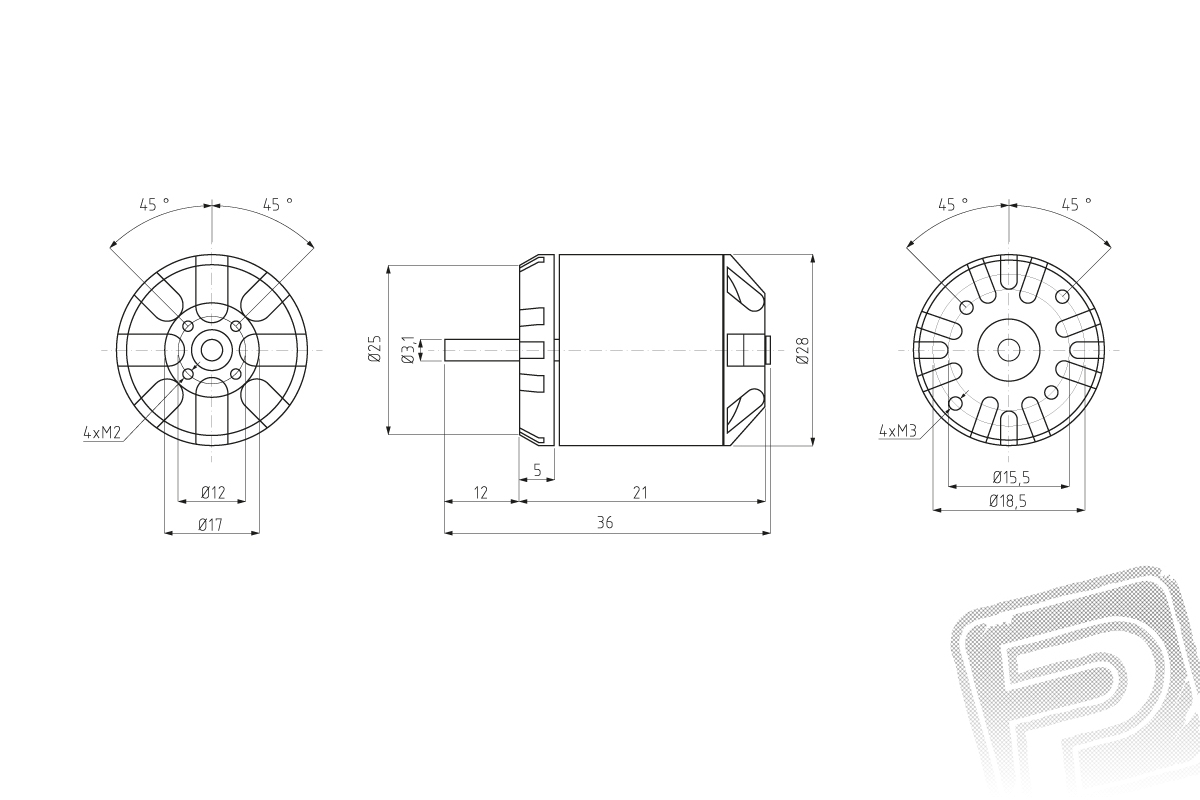 Montáž motoru: C2822-1200 je konstruován pro přední i zadní montáž. Při přední montáži za čelo motoru použijte nejméně dva (protilehlé), nebo čtyři šrouby M3, které zasahují do čela motoru v rozmezí 3 - 4 mm. Páry otvorů pro upevňovací šrouby v čele motoru jsou rozmístěny pravidelně o 180°na kružnicích o průměru 16 a 19 mm. Motorová přepážka by měla být z 1,5-2 mm letecké překližky. Sada pro zadní montáž (upevňovací kříž, unašeč vrtule pro zadní motáž) je dodávána spolu s motorem.