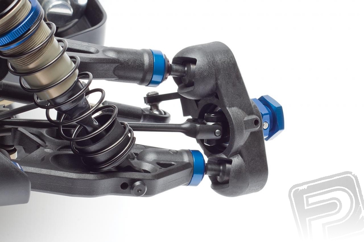 Nové přední zavěšení pro vyšší flexibilitu a lepší odolnost. Kuličková ložiska, hliníková těla nastavitelných 16mm Big Bore tlumičů. Rafinovaná geometrie zavěšení s vložkami pro rychlé a snadné nastavení roll centeru a další.