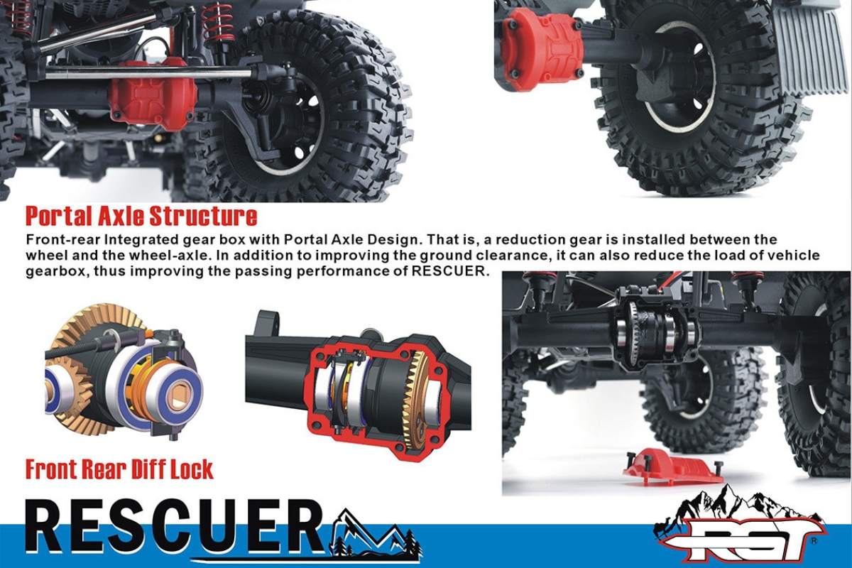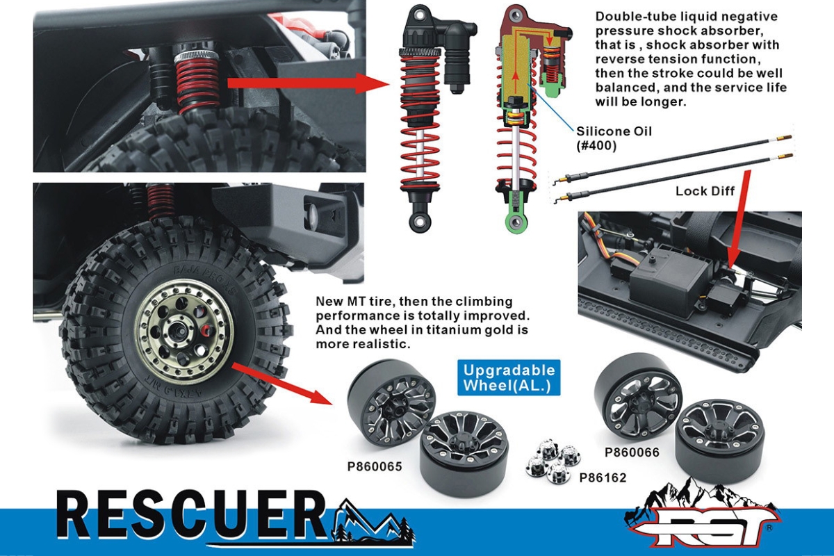 Rescuer má pevný rám podvozku, rozvor 324mm, 2rychlostní převodovku s reverzní rotací, maximální úhel zatáčení 42 stupňů, portálové nápravy s uzamykatelnými diferenciály, kovové převody, nastavitelné kovové "piggyback" tlumiče s dvojími pružinami, kvalitní utěsněná ložiska, nebo kovové CVD poloosy.