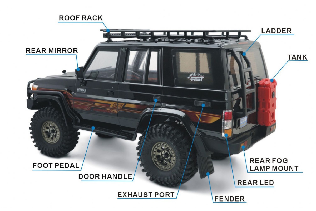 1,5mm lexanová karoserie má průhledná okna, otevíratelnou kapotu skrývající kryt motoru V8 vpředu, dedikovaný LED světelný modul a řadu doplňků, jako je střešní zahrádka, přídavná světla, šnorchl, zpětná zrcátka, kliky dveří, žebřík, nádrž a další.