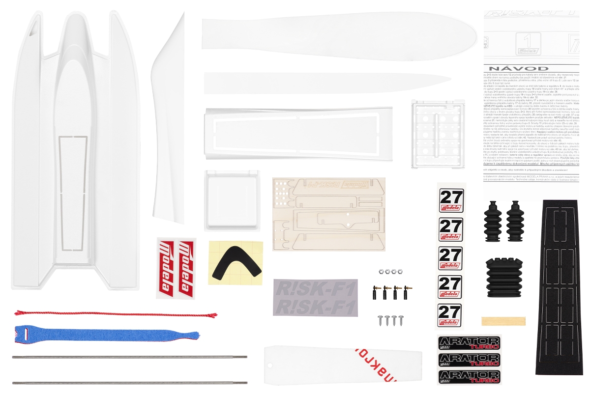 Slepený a obrobený výlisek plováku z ABS Vnitřní přepážky pro serva, Rx a baterii Překližkovou motorovou přepážku Překližkový stojánek Táhla a koncovky Sadu samolepek Podrobný textový a obrázkový návod ke stavbě