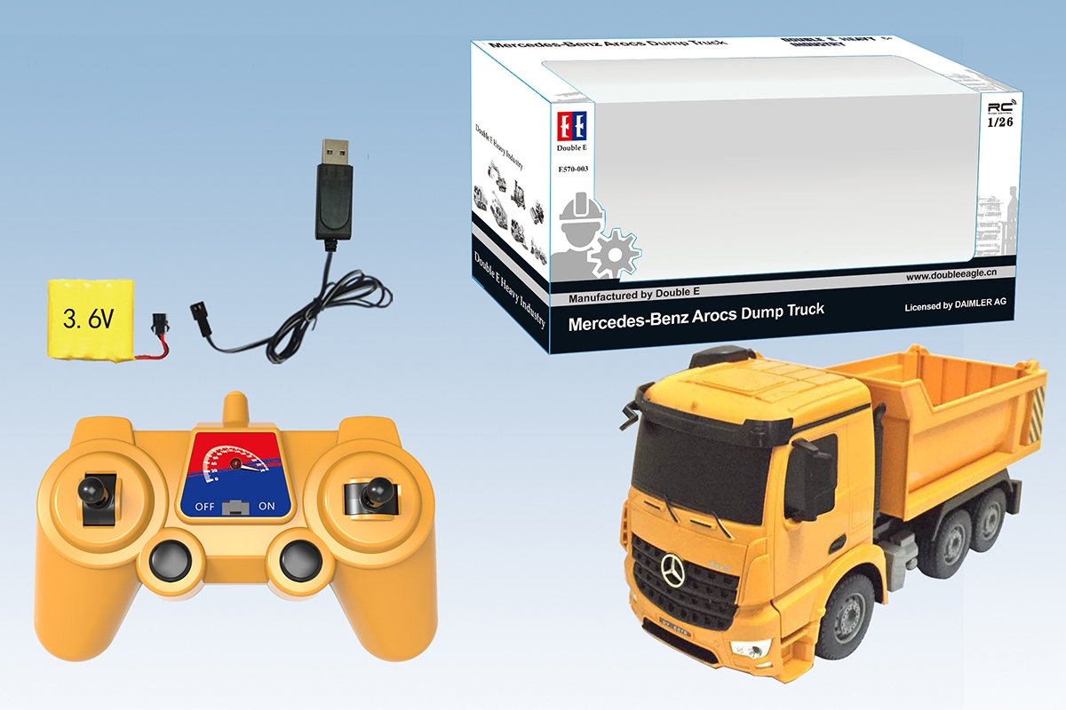 Model nákladního automobilu Mercedes-Benz Arocs v měřítku 1:26. Jízda dopředu a dozadu, zatáčení doleva a doprava, zvednutí a položení korby, a další funkce. Dosah 20 m, rychlost jízdy 3,6 km/h. Součástí balení je originální akumulátor a nabíječ.