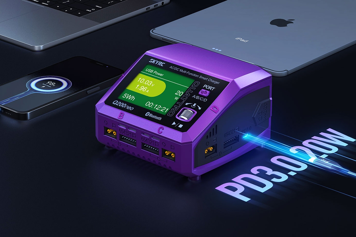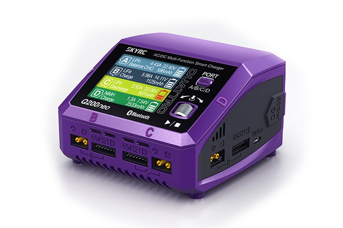 Čtyřkanálový nabíječ SKY RC Q200neo 400W byl konstruován se snahou poskytnout vše potřebné pro nabíjení čtyř akumulátorů proudy současně „pod jednou střechou" včetně síťového zdroje, s jednoduchou obsluhou a možností komunikace s aplikací SkyCharger. Q200neo umožňuje nabíjet a vybíjet běžné typy článků (NiCd, NiMH, Li-poly, Li-ion, Li-Fe, Li-HV, Pb), navíc jsou všechny kanály vybaveny vestavěnými šestikanálovými balancery, které zajišťují velmi bezpečné a komfortní nabíjení lithiových akumulátorů.