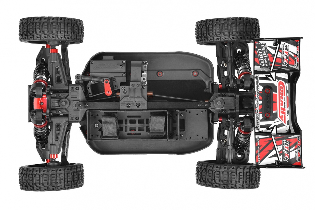 Dodávaný Regulátor Team Corally Torox 185A 4-6S (není součástí balení)  je kromě dalších bezpečnostních a výkonnostních možností vybaven ochranou LiPo akumulátoru, zatímco 4pólový střídavý motor Team Corally Kuron 2050kV (není součástí balení) poskytuje působivou rychlost a točivý moment. Přesné ovládání řízení zajišťuje HV-7225 HV Servo s kovovými převody (není součástí balení). Pohodlná 2,4GHz vysílačka CT2R (není součástí balení) poskytuje pevné rádiové spojení a nastavitelné funkce pro pohodlí při řízení.