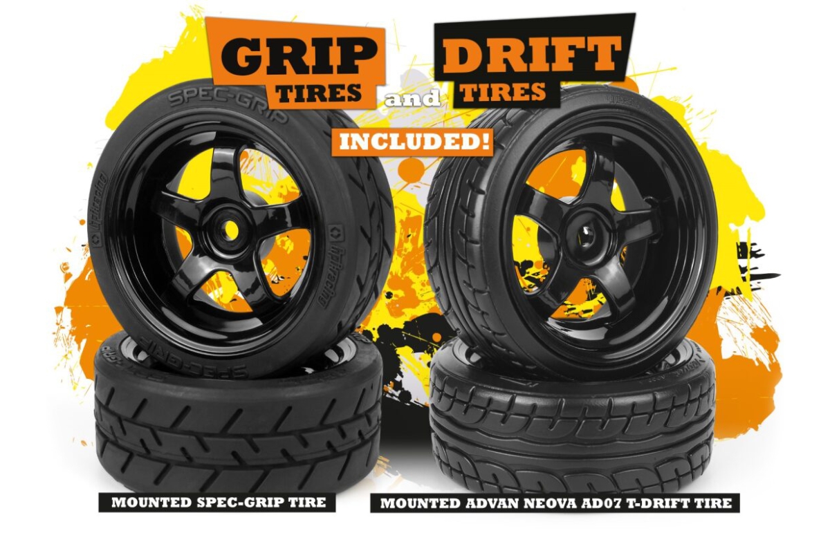 Ani tady jsme se ale nezastavili - součástí balení není jedna, ale DVĚ sady pneumatik, takže si můžete vybrat, zda chcete jezdit driftem, nebo rychlou "přilnavou" jízdou na okruhu či na ulici! Je to zcela na vás!
