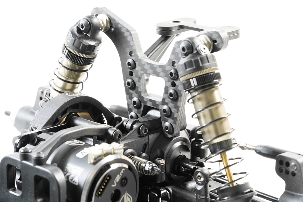 Součástí sady S12-2D EVO LIMITED je zcela nový 5,5mm systém kulových čepů. Součástí je také nastavitelná Ackermann deska a karbonové desky řízení. S12-2D EVO LIMITED má nová zakřivená spodní ramena, která zajišťují nižší polohu tlumičů, což vede ke snížení těžiště.