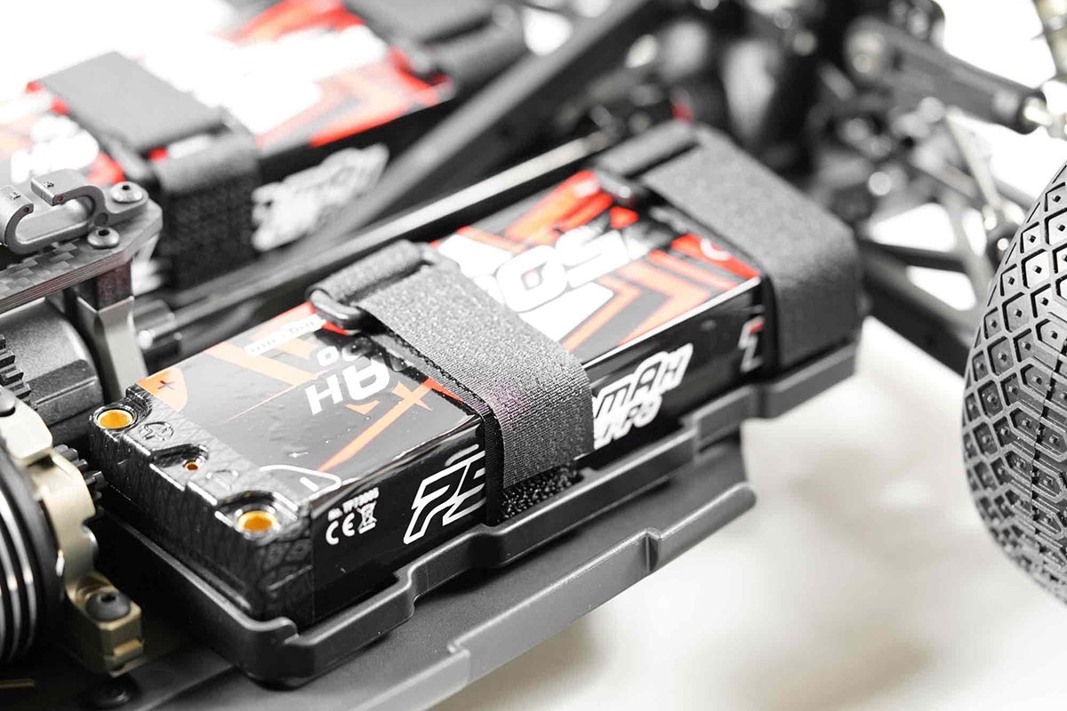Uspořádání středového podvozku je zcela nový design pro S35-4e EVO. Poskytuje dva způsoby nastavení LiPo sada. Standardní 2S pack (nebo 2S shorty) lze použít v SADLE PACK poloze pro nižší těžiště. A jednu jednotku 4S standardní sady (nebo shorty) lze také umístit do boční polohy.