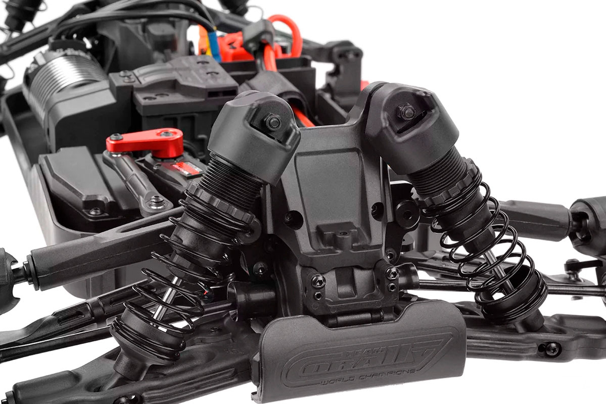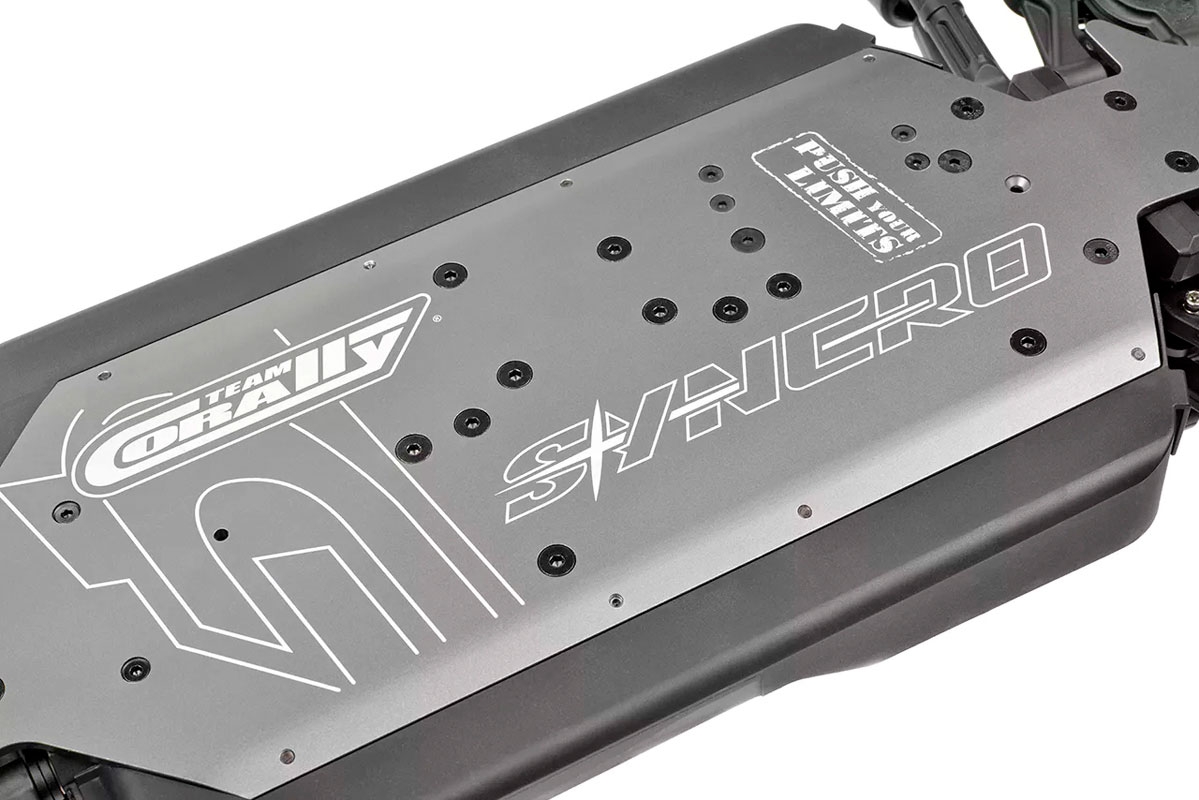 Team Corally se u podvozku modelu Syncro4 vůbec nedrží zpátky. Díky využití dobře známých a otestovaných ramen zavěšení z předchozích modelů, jako jsou Radix6 a Sketer, spolu s robustními předními a zadními těhlicemi zajišťuje Syncro4 špičkový výkon v jakémkoli terénu. Díky zařazení 4mm CNC frézovaných držáků ramen známých z modelu Spark XB6 a precizně zkonstruovaných linků (řízení, serva a zadních horních ramen) si model Syncro4 zachovává odolnost a bezkonkurenční výkon. I po zavedení nových plastových tlumičů a parohů si Team Corally pevně stojí za tím, že přináší systém odpružení, který nedělá kompromisy v kvalitě, odolnosti ani výkonu.