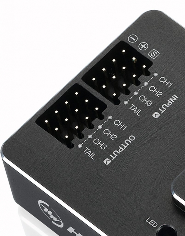 Vrtulník: Kabely se signálem pro serva desky cykliky (CH1, CH2, CH3) a vyrovnávací rotor (TAIL) z flybarless řídící jednotky nebo přijímače zapojte do zásuvek skupiny „INPUT“. Serva desky cykliky a vyrovnávacího rotoru připojte do odpovídajících zásuvek skupiny „OUTPUT“.