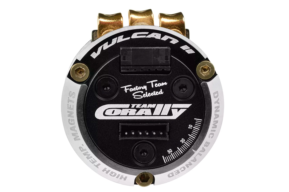 TEAM CORALLY VULCAN 2 střídavý motor pro třídy STOCK. Provozní napětí: 1S-3S, délka samotného těla 52,4mm, průměr: 35,8mm, váha: 165g, otáčky na 1Volt: 3.000 o/min, hřídel 3,17mm, Výkon: 130W, Rotor: 12,5mm. EFRA, BRCA, IFMAR, DMC, ROAR regulérní